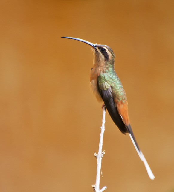 Mede 15 centímetros. Uma das maiores espécies de beija-flores brasileiras. Destaca-se por ter cauda longa e com cada pena da mesma terminando em uma ponta branca, contrastando com o centro negro e com retrizes centrais prolongadas. O bico é comprido e ligeiramente curvado para baixo, com a base da mandíbula vermelha. Faixa superciliar e infraocular pardacentas delimitando uma faixa malar negra. Garganta, partes inferiores e coberteiras superiores da cauda cor de canela uniforme. Dorso esverdeado.
