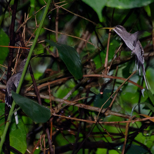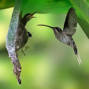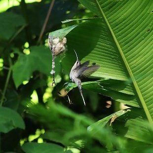 Seu ninho tem forma cônica alongada, terminando em um apêndice caudal mais ou menos longo, servindo de contrapeso. É feito de material macio como paina e detritos vegetais que são acumulados em espessa camada de material. O ninho é suspenso à face interior das folhas de palmeiras, samambaias, musáceas, Helicônia, etc., em raízes finas pendentes sob barrancos sombreados. Com o peso do ninho dobra-se o folíolo ou a ponta da folha, ficando o restante da mesma protegendo o ninho. Põe geralmente 2 ovos alongados e brancos.