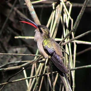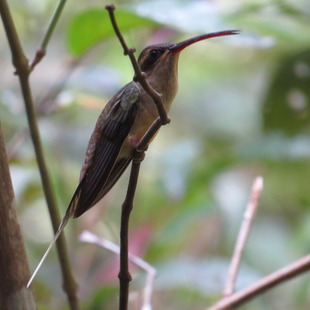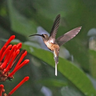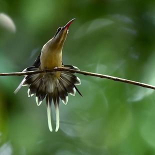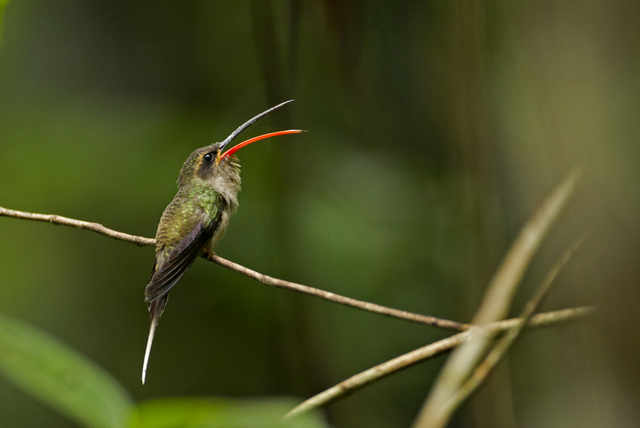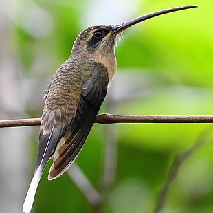 Partes superiores ocre-esverdeadas; faixa superciliar e infraocular ocre, delimitando uma área malar preta com estrias ocre-amareladas; bico longo e muito curvo com mandíbula vermelha ou alaranjada. Partes inferiores ocres com infracaudais cinza-claro; asas pretas; cauda com retrizes pretas com as pontas brancas e retrizes centrais prolongadas pretas com as pontas brancas.