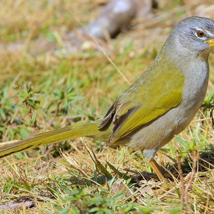 Muito semelhante ao sabiá-do-banhado (Embernagra platensis), porém com um anel estreito branco ou amarelado em torno do olho (o anel é interrompido anterior e posteriormente), e uma linha da mesma cor acima do bico anegrado; dorso verde uniforme, e não estriado como no sabiá-do-banhado; garganta branco amarelada.