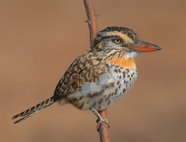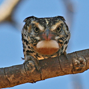 Possui o bico avermelhado. A cabeça, entretanto, é toda escura, com um colar amarelado e uma mancha da mesma cor no peito. Tanto a barriga como o peito são todos salpicados de negro, em contraste com o cinza claro. A cabeça é grande e larga, desproporcional ao corpo.