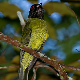 Seu nome científico significa: do (grego) karpos = fruto; e ornis = pássaro; e do (grego) melas = preta, preto; e -kephalos = cabeça. ⇒ pássaro-das-frutas de cabeça negra.