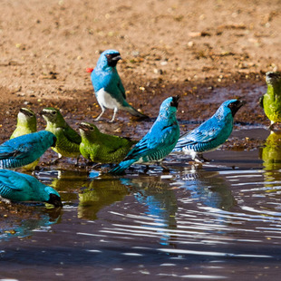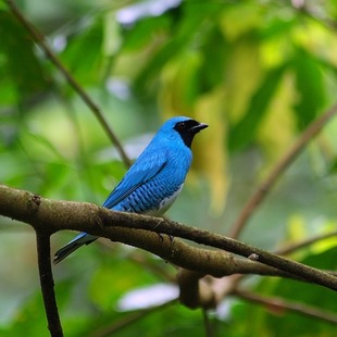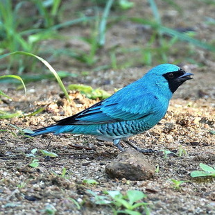 O macho desta espécie é azul-brilhante, com a cara e a garganta negras.