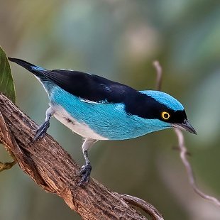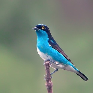 Ambos os sexos têm íris amarela. O macho é azul-turquesa com máscara, asas e cauda pretos. O centro da barriga e crisso são brancos como as coberteiras inferiores das asas, mostrado completamente na frente da asa. A fêmea é menos colorida, sendo amplamente cinza marrom-oliva pálido.