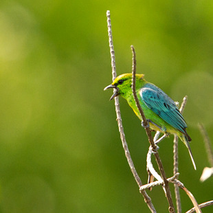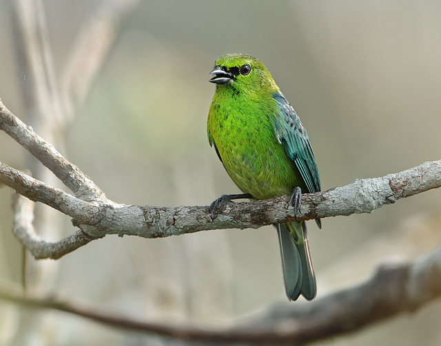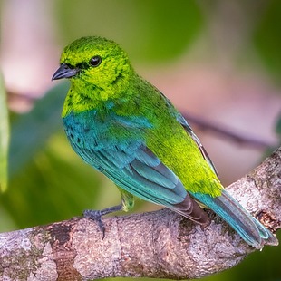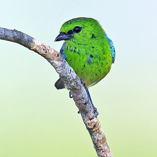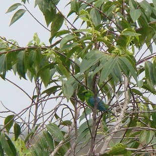 O macho da espécie apresenta a maior parte da plumagem na coloração verde intenso com asas e cauda azul-turquesa. Os lores são pretos. Pequenas e poucas manchas pretas ornamentam a região da garganta e do peito.