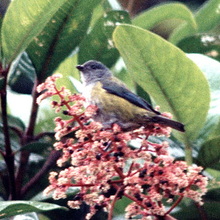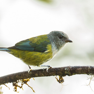 A fêmea apresenta a cabeça e a nuca de coloração cinza opaco. O dorso é amarelo esverdeado. As coberteiras primárias são cinza-azuladas e as rêmiges e retrizes são azul-esverdeadas. A porção ventral é, em grande parte, de coloração cinza opaco como a cabeça, os flancos ventrais são amarelo-esverdeados.