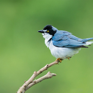 Tem cerca de 13 centímetros e pesa aproximadamente 14 gramas. Chama a atenção pelo branco puro do loro e do lado inferior, que contrasta com o negro do píleo. Tem manto cinzento, íris e pernas amarelas. A fêmea não tem o desenho negro, tendo o seu lado inferior amarelo e mandíbula branca.