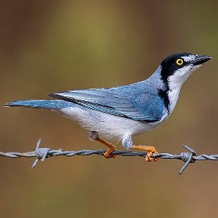O macho é mais colorido do que a fêmea, com o amarelo vivo do olho das aves adultas destacando-se contra o negro dominante na cabeça e lados do pescoço. Entre o olho e o bico, uma listra branca, mesma cor das partes inferiores. O dorso é cinza levemente azulado, assim como a cauda. As penas longas das asas são cinza-escuro, ocasionalmente observadas na ave pousada. Já a fêmea possui a mesma distribuição geral de cores, exceto o negro da cabeça. A íris é amarelo mais apagado, assim como o cinza das costas. Partes inferiores com tom levemente amarronzado. O bico é amarelado, enquanto no macho é cinza na base com a ponta escura.